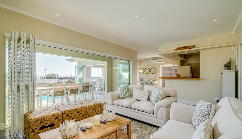 The contemporary & comfortable living area has been decorated in creamy natural tones offering a light and relaxing environment. Flat screen TV. 8 seater dining table. Access onto the pool deck.